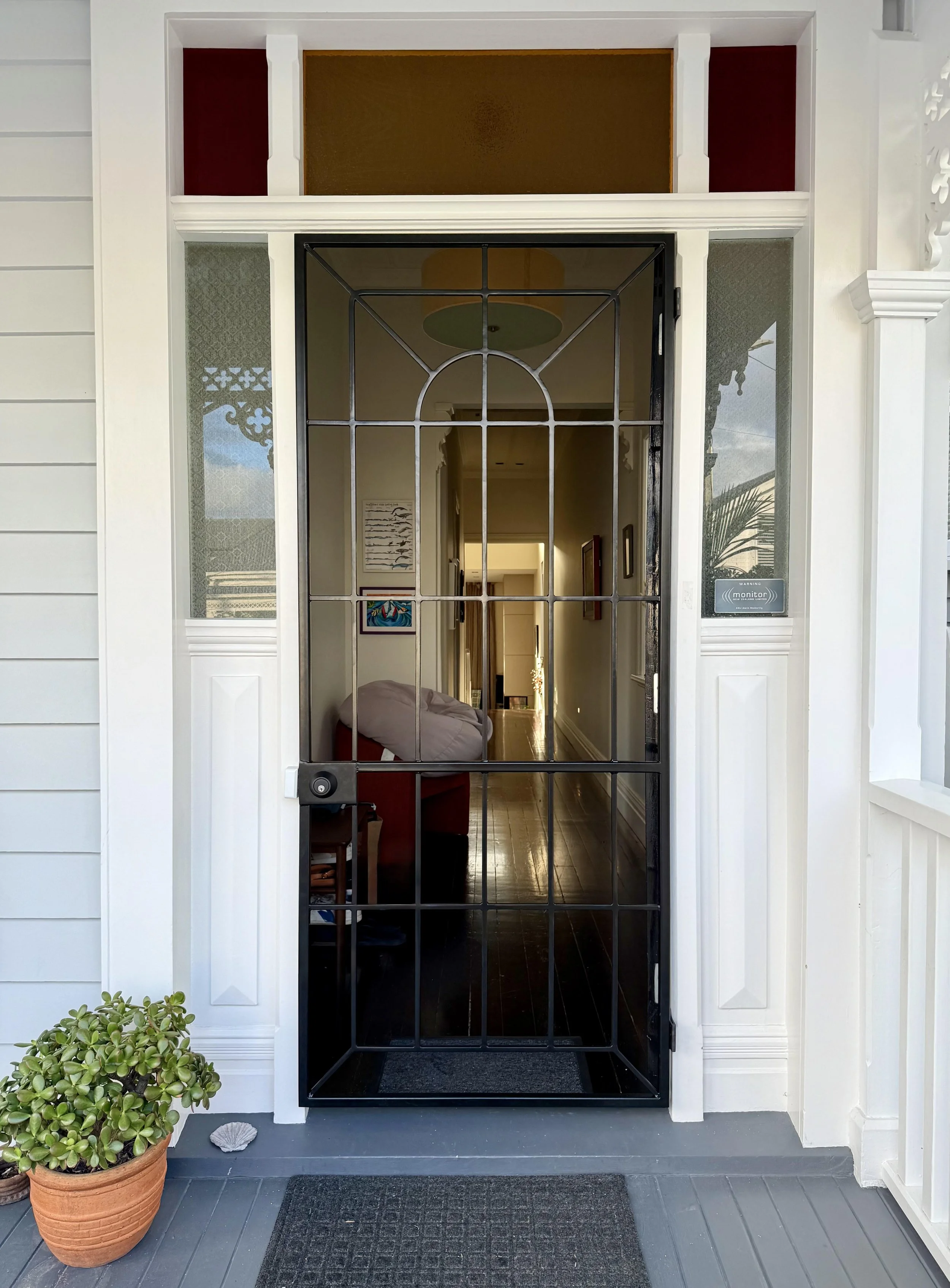 A classic steel frame with a central arch, buttressed by a tight steel grid. Loved by high arched hallways, to mirror your existing design and framework.
